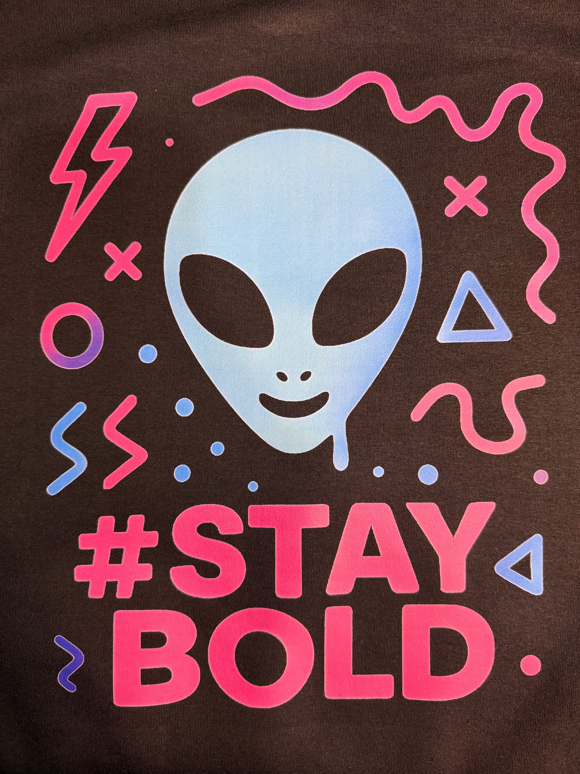 Embrace your bold side with the Alien Drip sweatshirt, featuring a striking drippy alien head framed by sharp geometric shapes. The daring design on the back is completed with the hashtag #STAYBOLD, making a strong statement wherever you go. This sweatshirt is made for those who aren’t afraid to stand out and express their unique style with confidence.