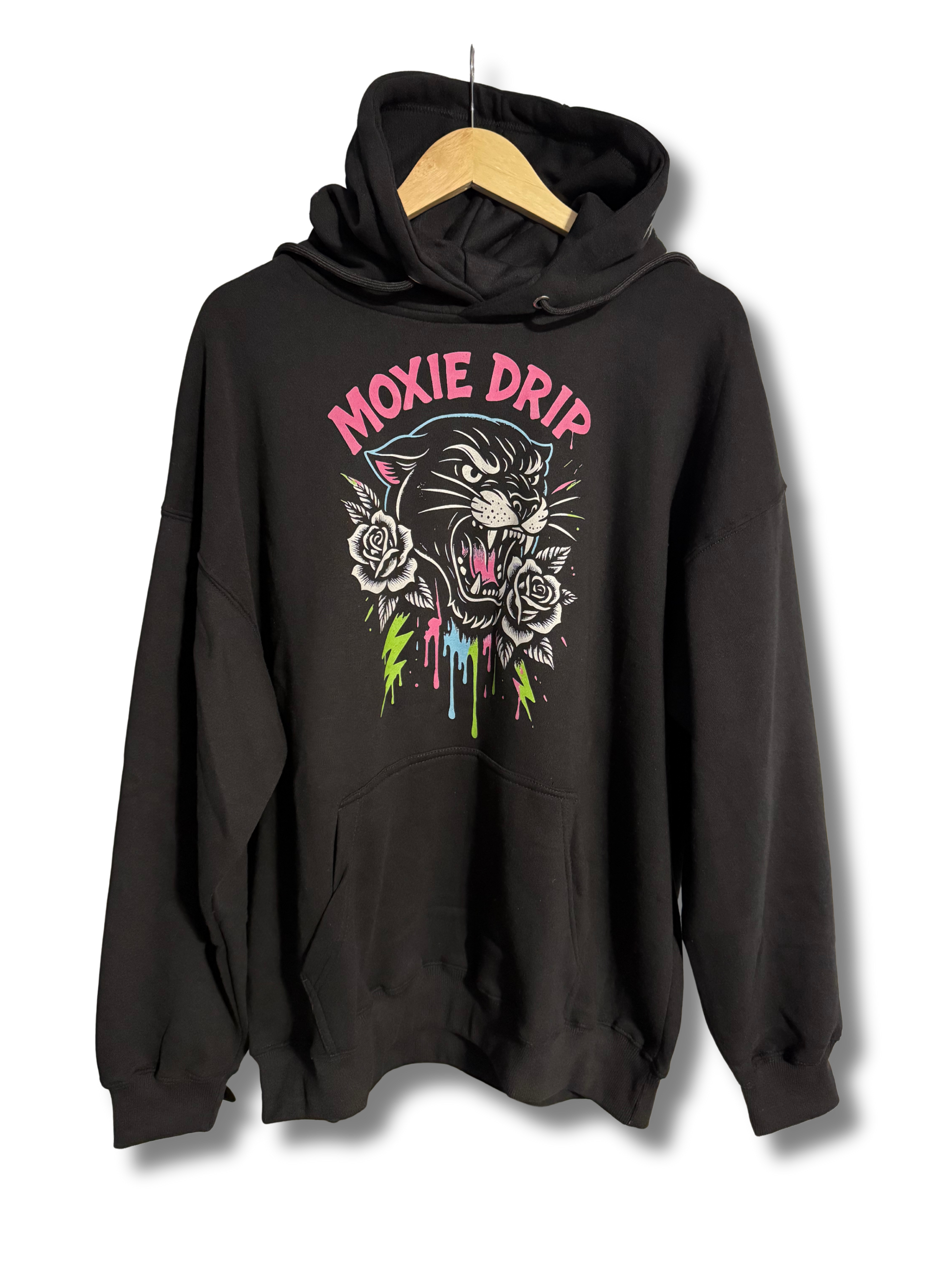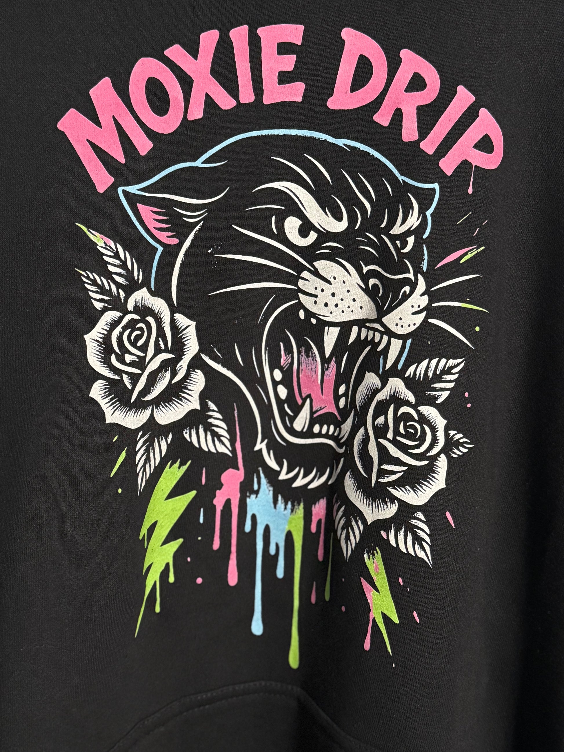 Unleash bold style with the Black Panther design, featuring a fierce black panther framed by vibrant drips and striking flowers on each side. The powerful "Moxie Drip" lettering crowns the panther, making this piece perfect for those who dare to stand out with fearless flair.
