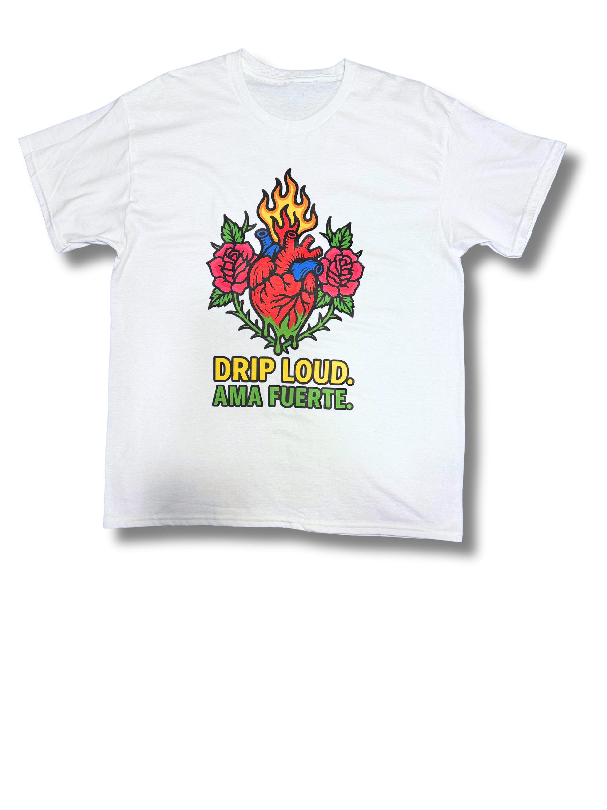 Embrace bold passion with the Burning Love tee, featuring a striking heart engulfed in flames flanked by two vibrant roses. The powerful phrase "Drip Loud. Ama Fuerte." anchors the design, urging you to express yourself boldly and love fiercely. This daring shirt invites you to wear your fire and fearless spirit every day.