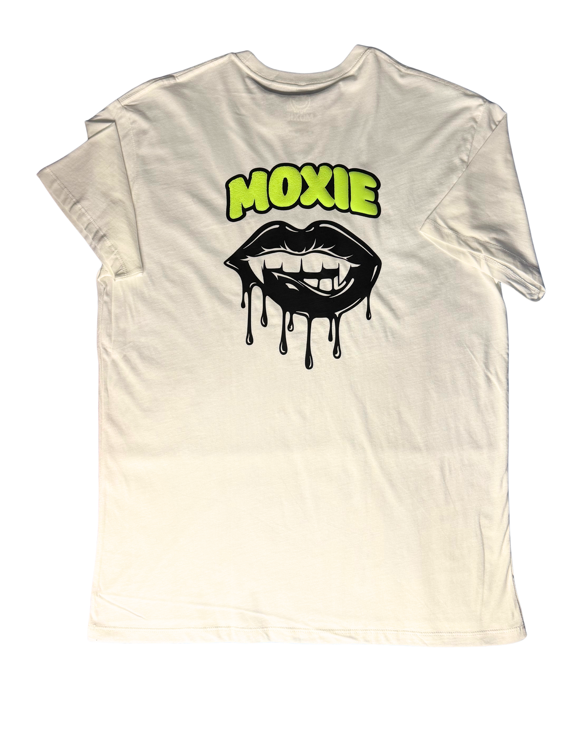 Make a bold statement with the Moxie Lip Bite t-shirt, featuring a striking puff neon vinyl design on the front. The vivid image of a vampire biting lips with dripping blood adds an edgy, daring touch to your look. Perfect for those who want to stand out and embrace their fearless style.