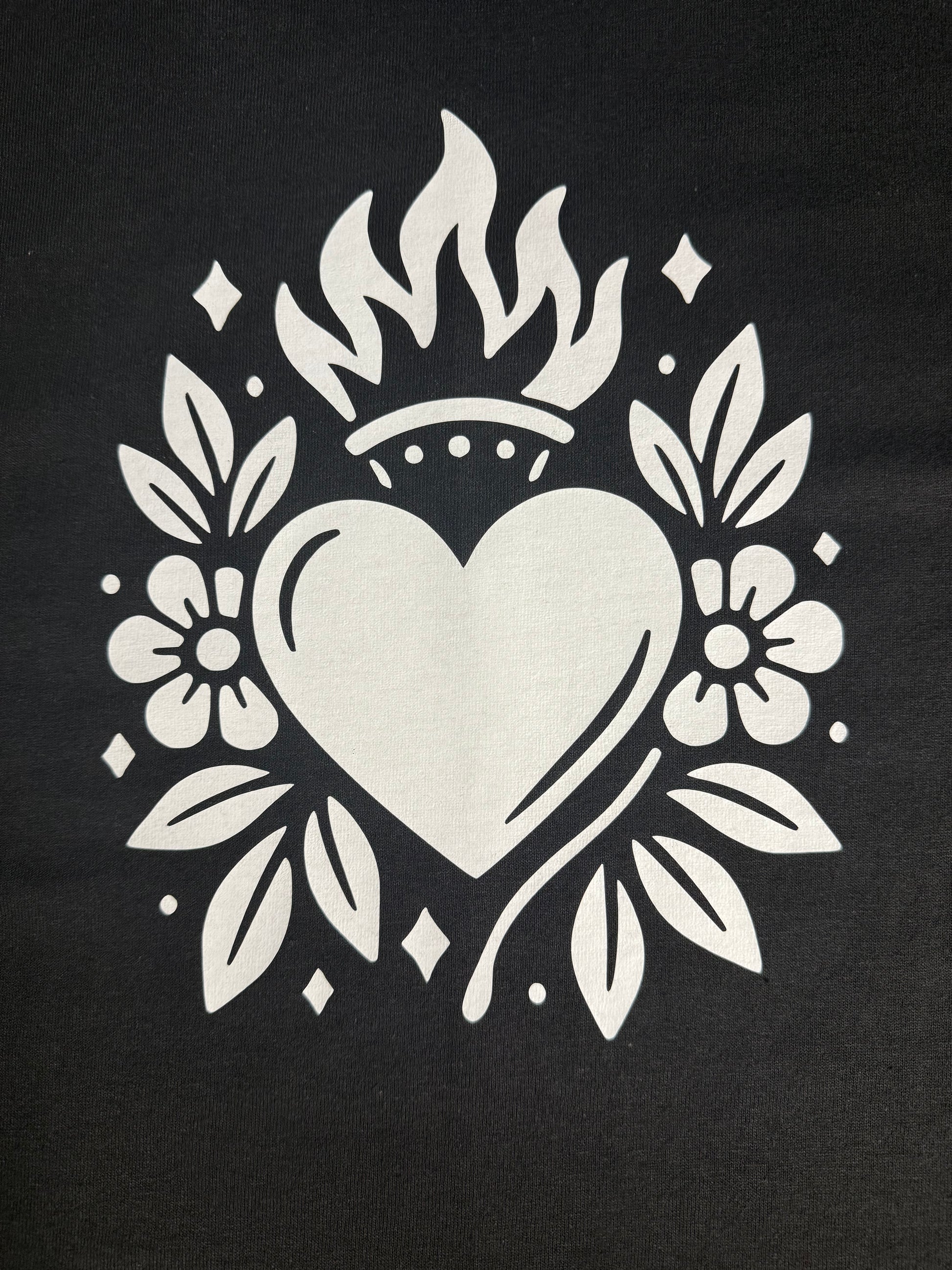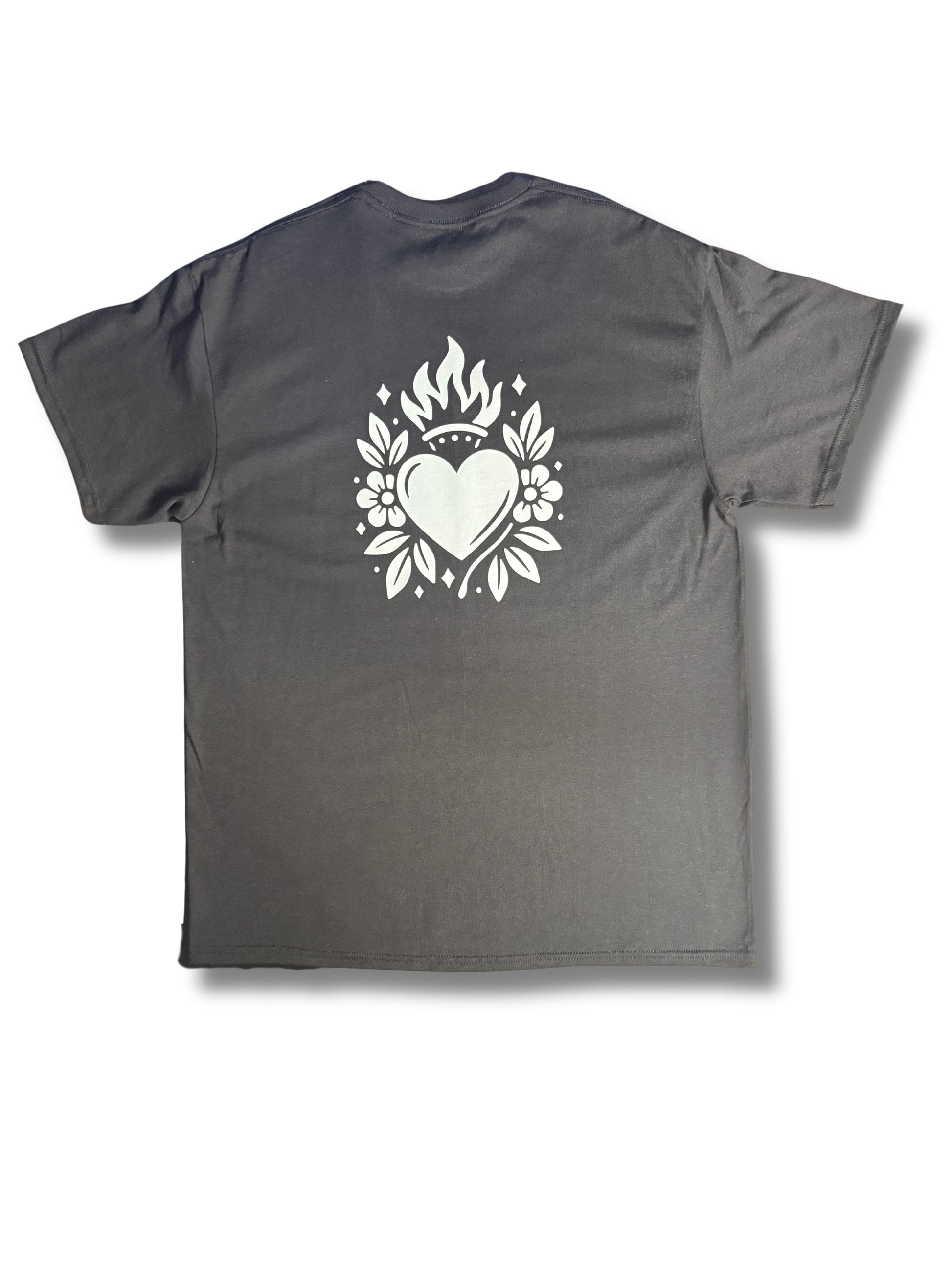 Show off your fiery spirit with the Sacred Heart shirt, showcasing a vibrant heart surrounded by flickering flames and graceful leaves. This playful design combines passion and nature in a MOXIE, eye-catching way—perfect for anyone ready to wear their heart on their sleeve with a fun twist.