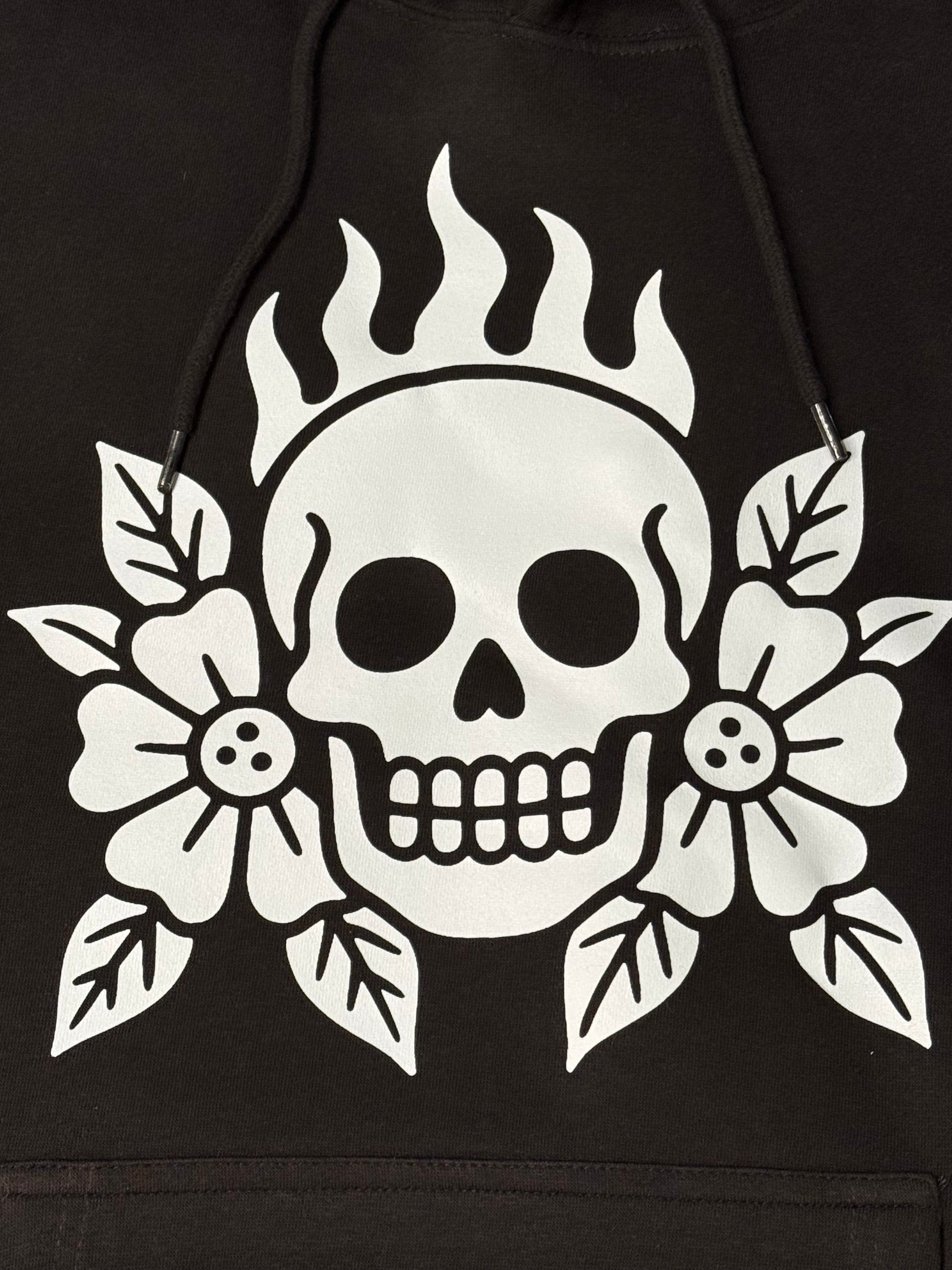 This striking design features a fierce skull crowned with blazing fire, encircled by delicate flowers. The bold contrast between flames and blooms captures a daring spirit—perfect for those who embrace both intensity and beauty in one fearless look.